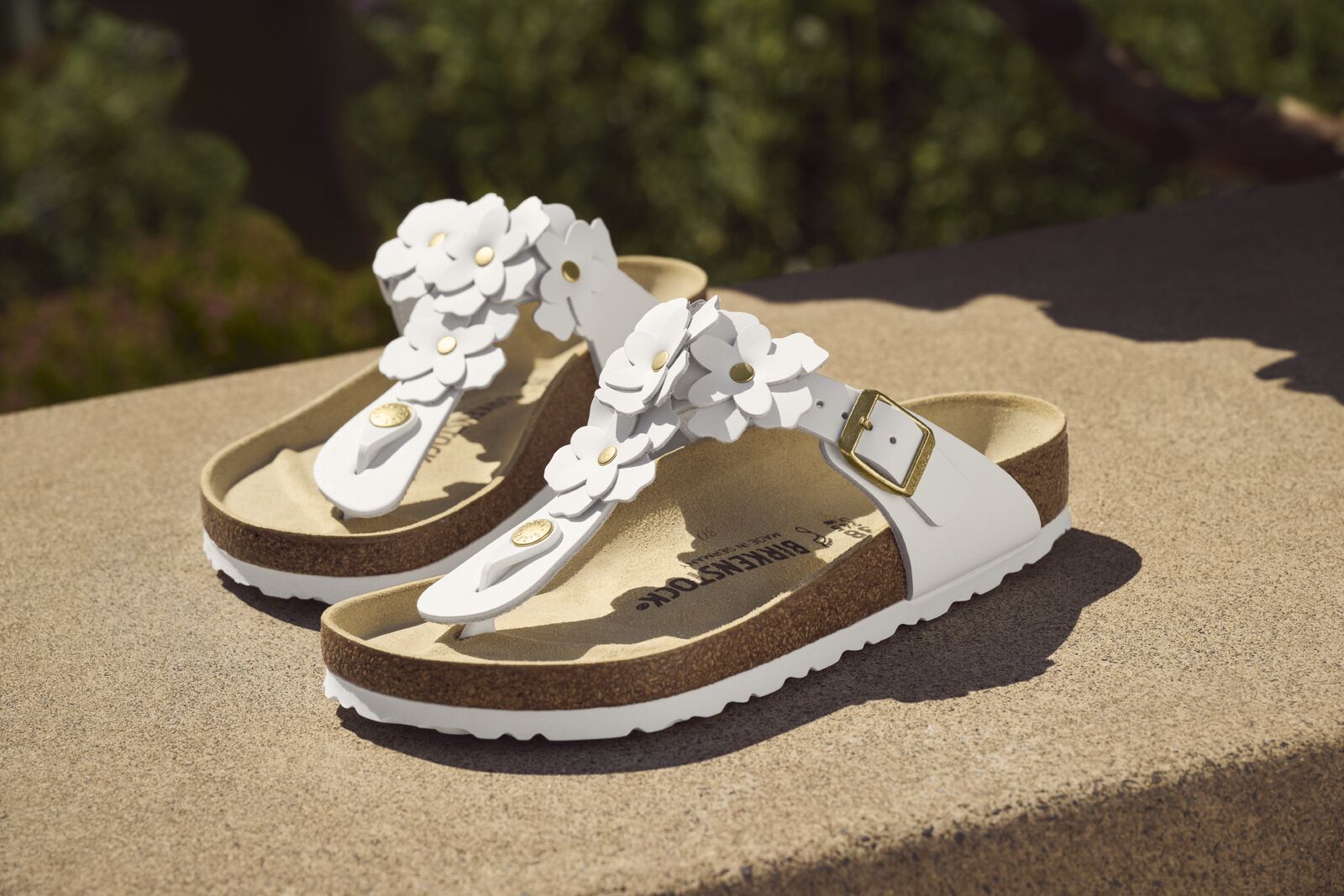 Appliqué flowers make a garden party of this season's Gizeh sandal. Pollinated with gold, especially soft leather sets the scene for cut blooms. The style stays rooted in original BIRKENSTOCK® comfort, with a contoured cork-latex footbed for the ultimate in support.